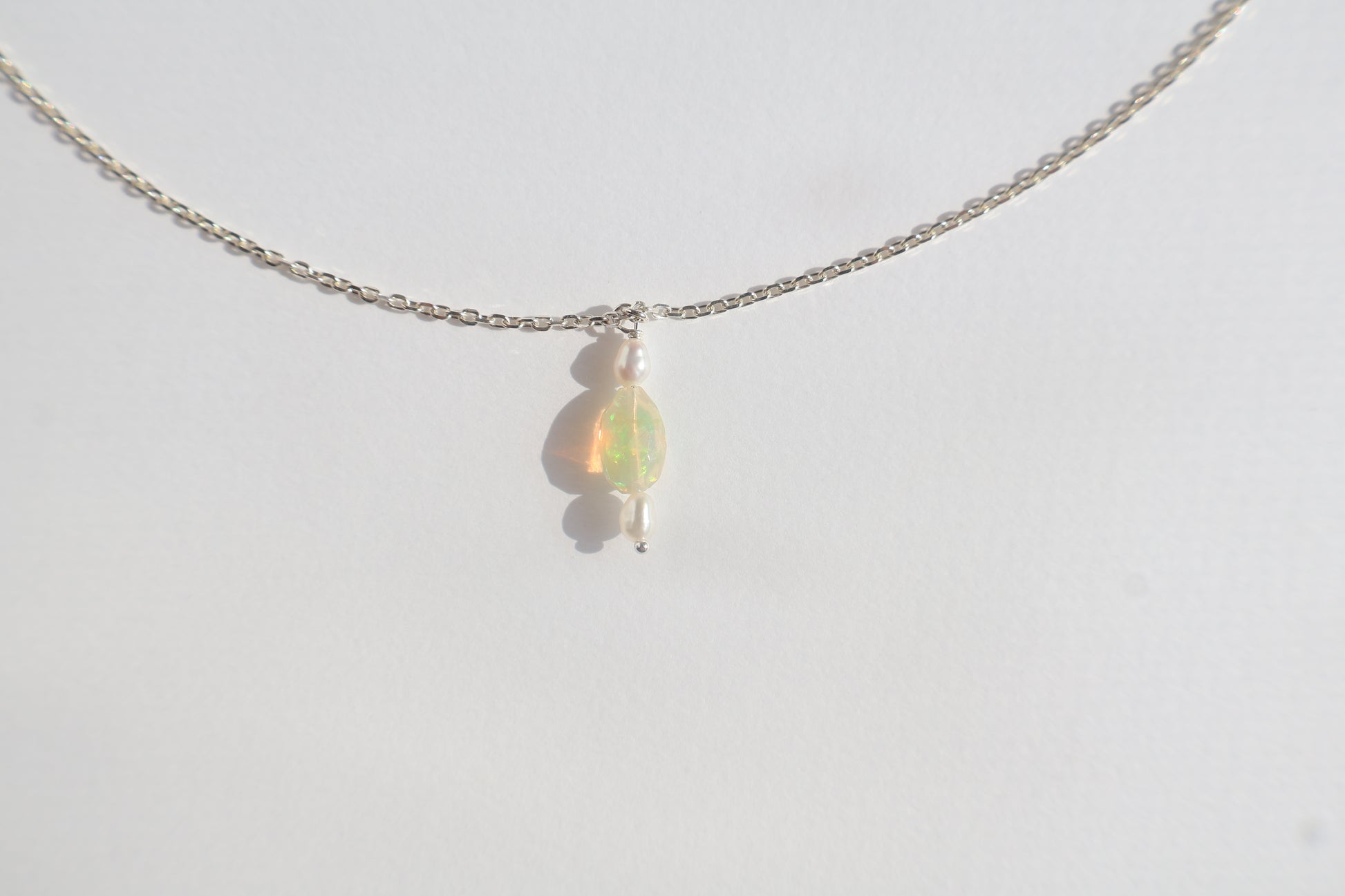貴族の娘たちが社交界にデビューした「Debutant(デビュタント) 」がインスピレーション。やわらかくめらりと輝くイエローのエチオピア産オパールと、ぽとんとふくよかな純白の美しさが印象的な淡水真珠。太陽の光でオパールらしい虹色が踊るように見られるのもとても楽しいジュエリーになります。