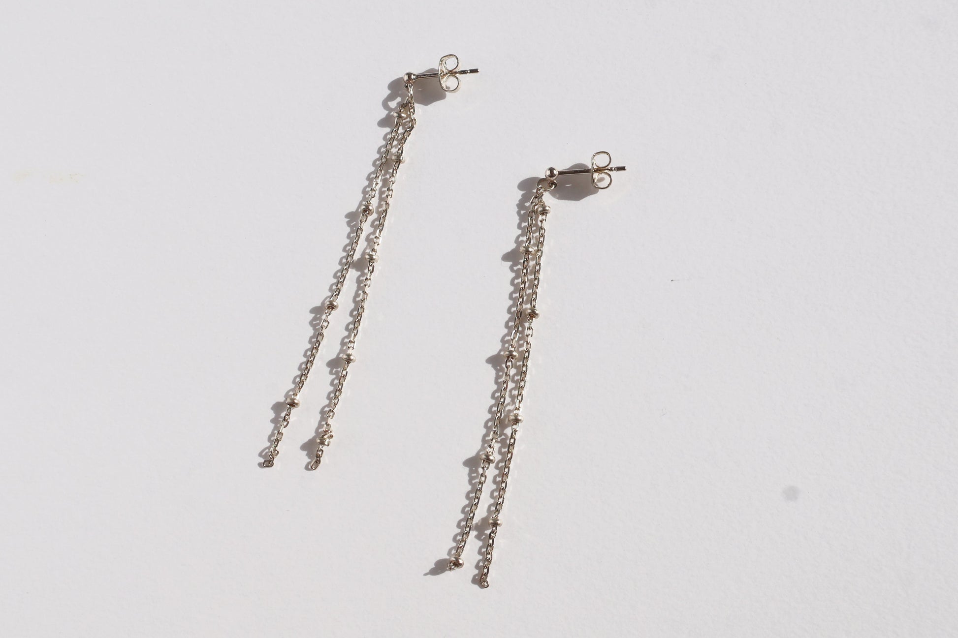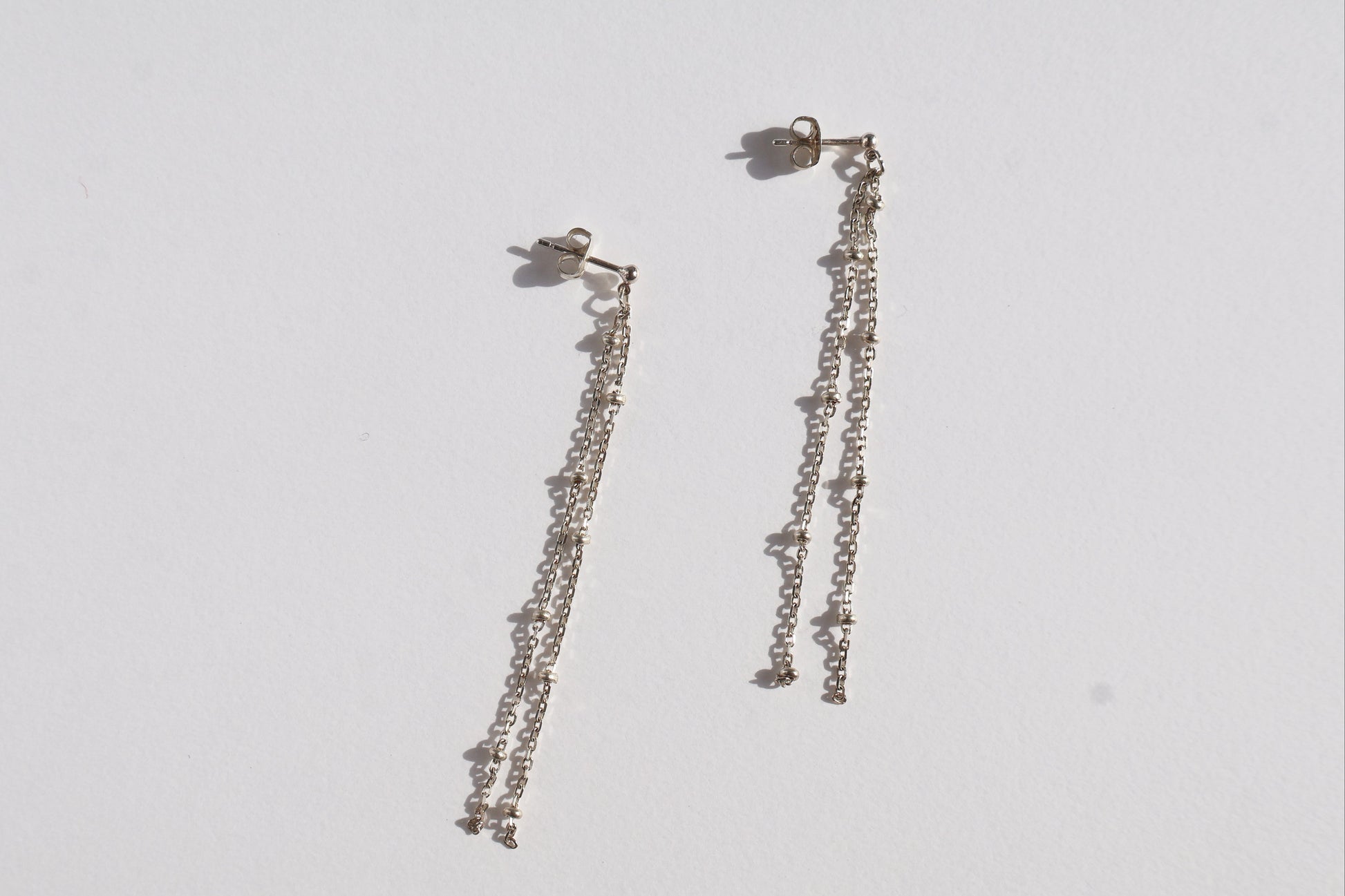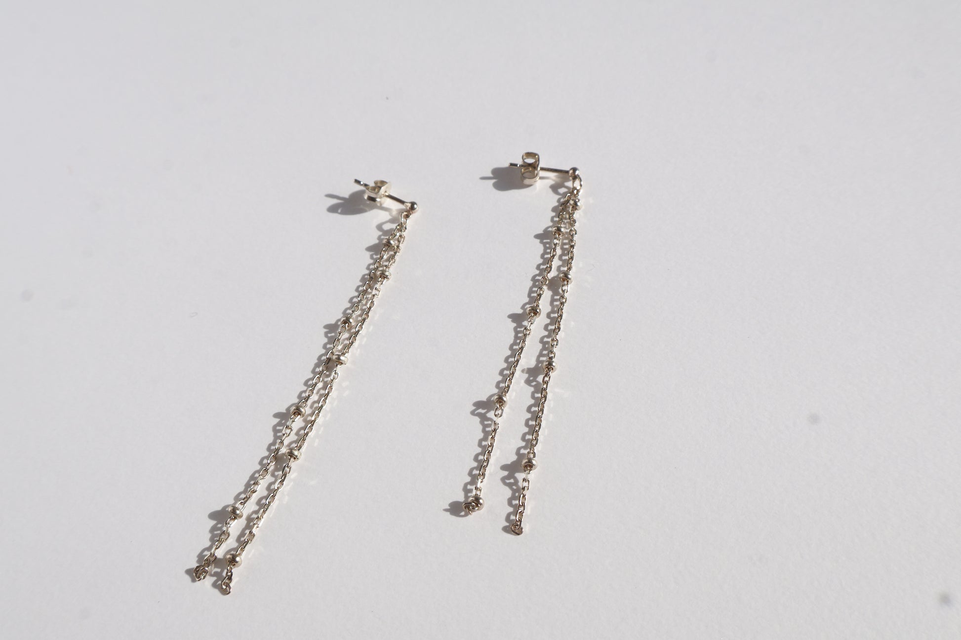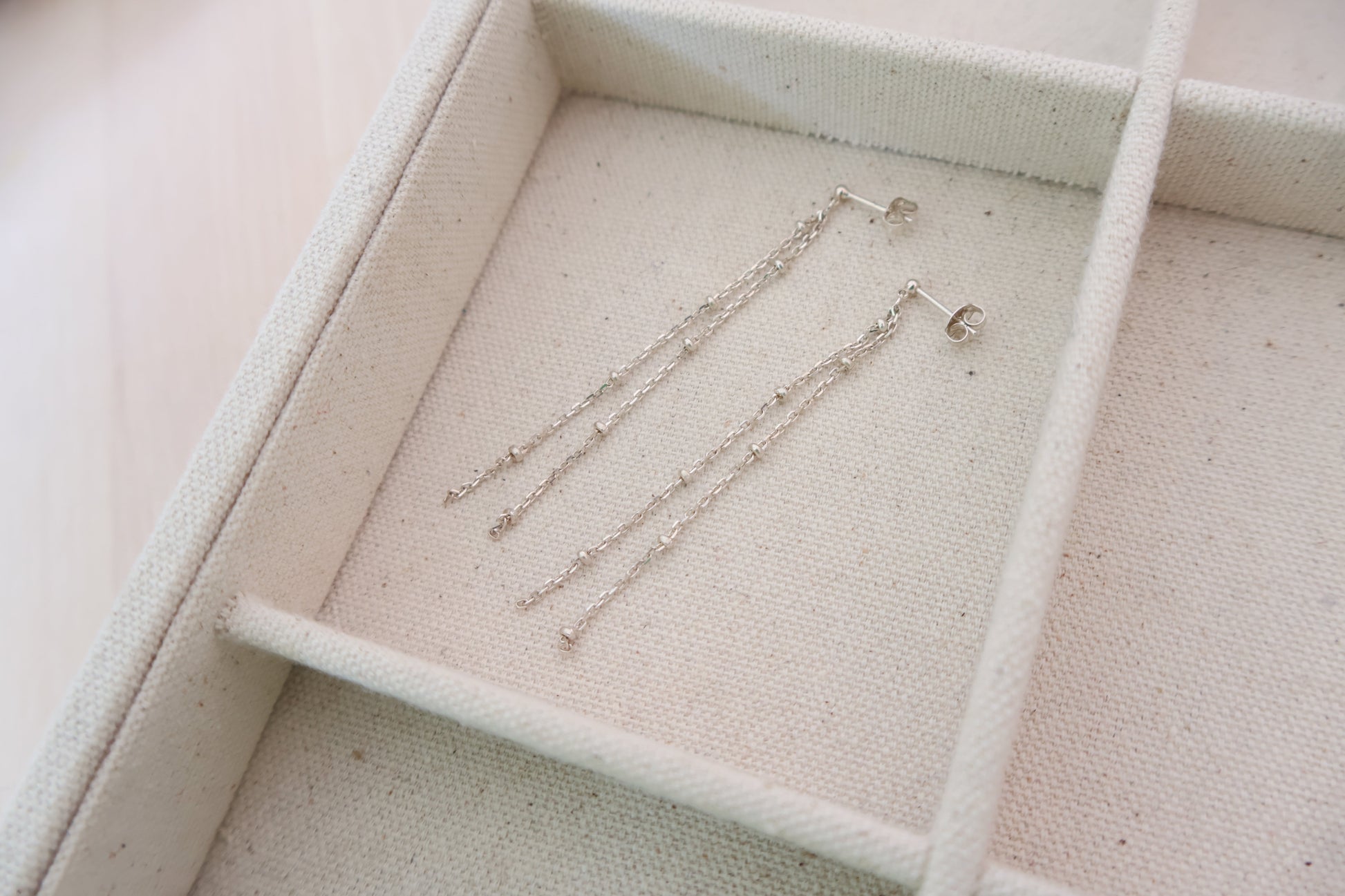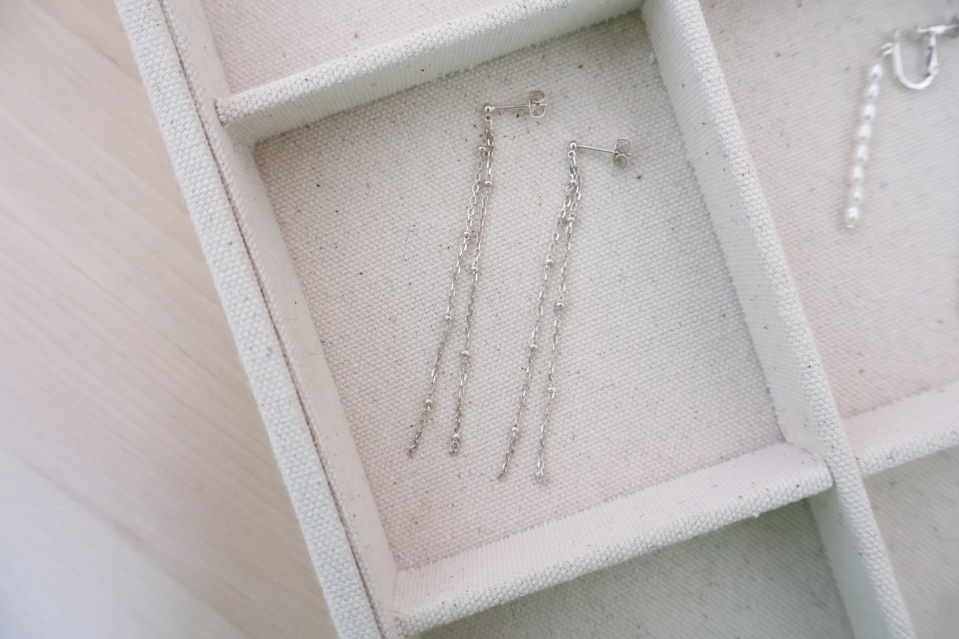 7cmの長めのシルパーのチェーンピアスは、光を捉えてきらきらと輝きます。首のラインを長く見せてくれて、顎がシャープに見えるため、首から頭までの全体のバランスを調和させてくれます。シルバーのキリッとした印象と、2連のチェーンがゆったりと揺れてくれるのが大人の余裕の美しさを表現します。特にアップスタイルのヘアスタイルと相性抜群で、ジュエリーの揺れ感と煌めきが引き立ち、色っぽさ◎。