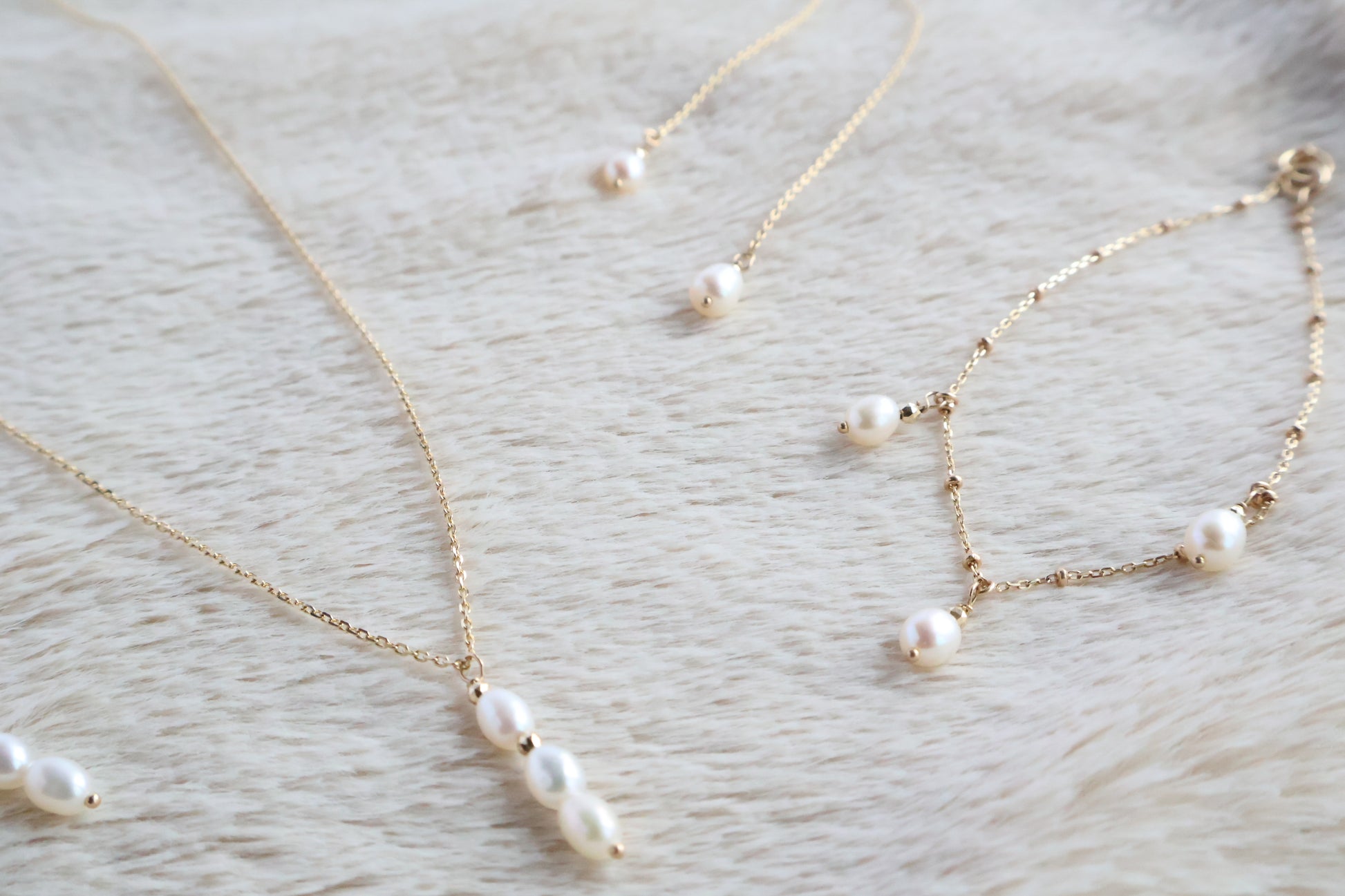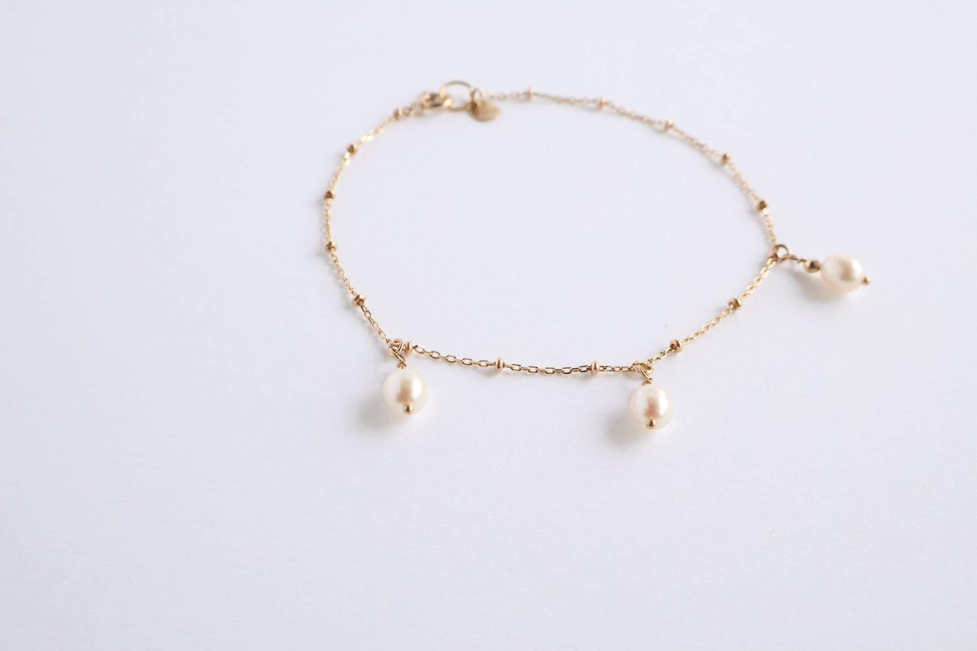 細やかなゴールドチェーンと艶やかなパールが、手元に軽やかな輝きを添えます。
