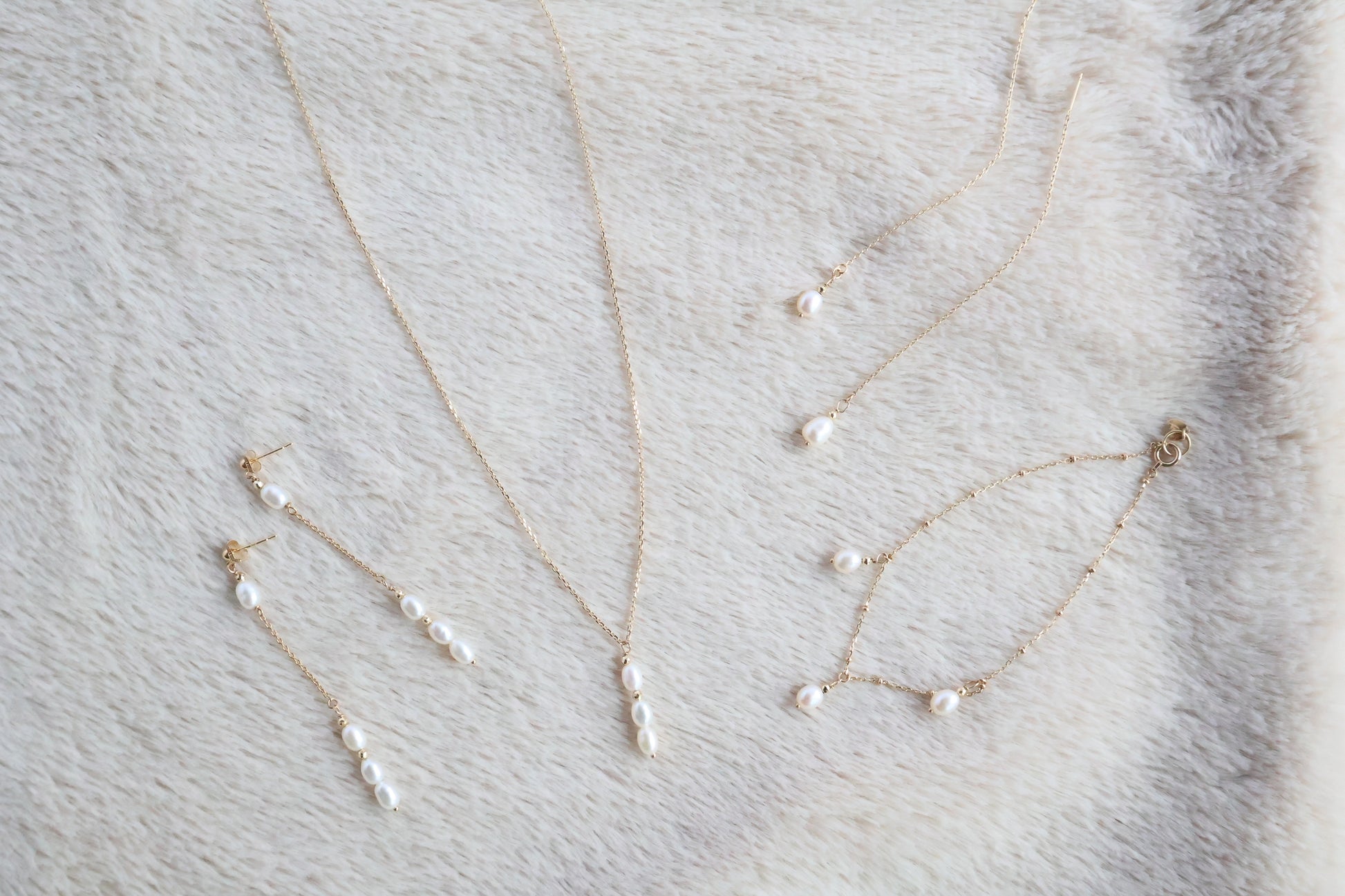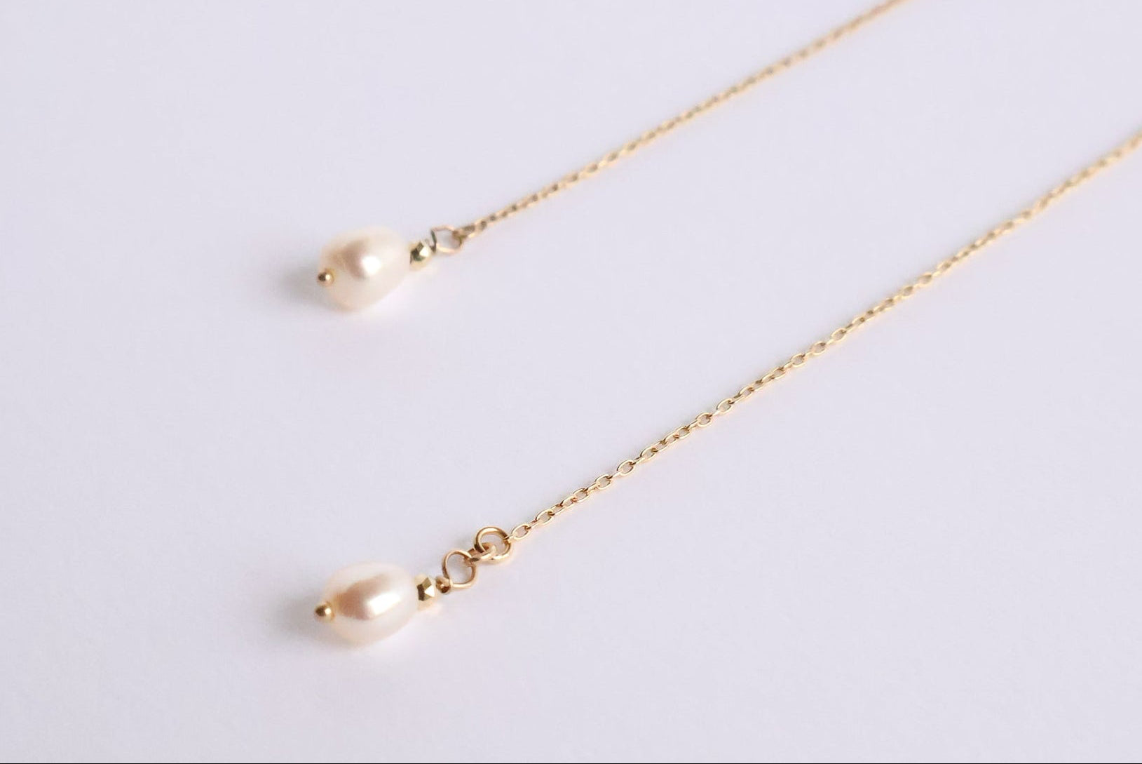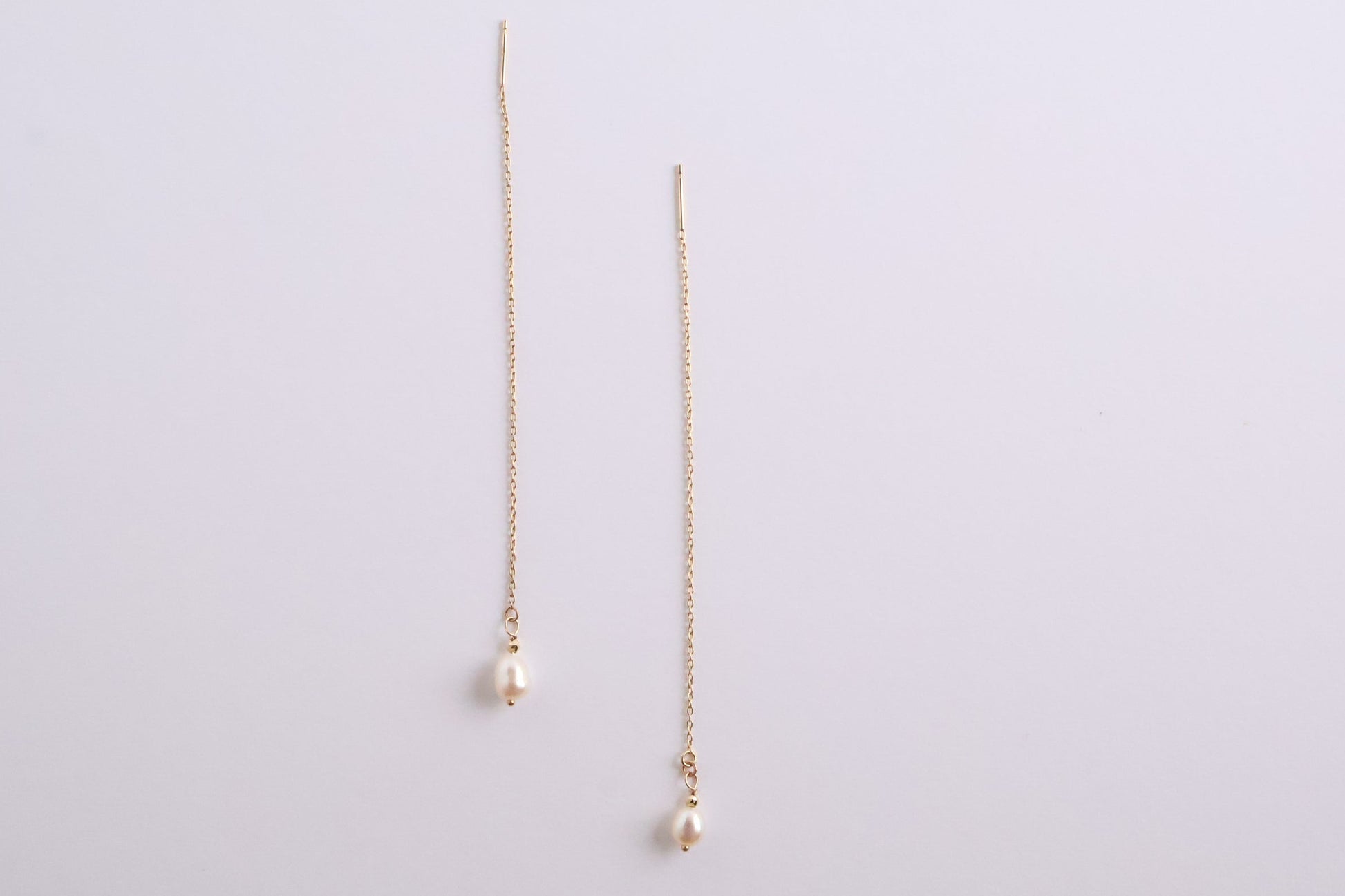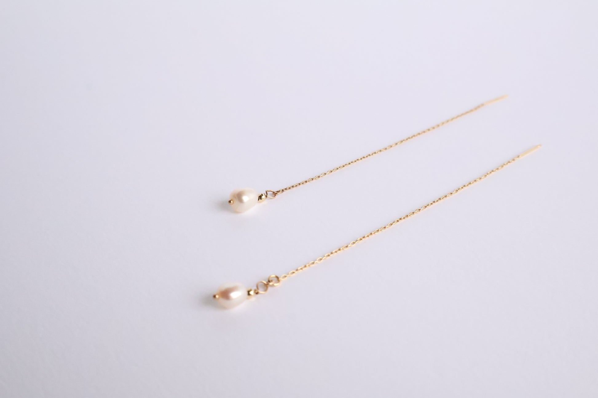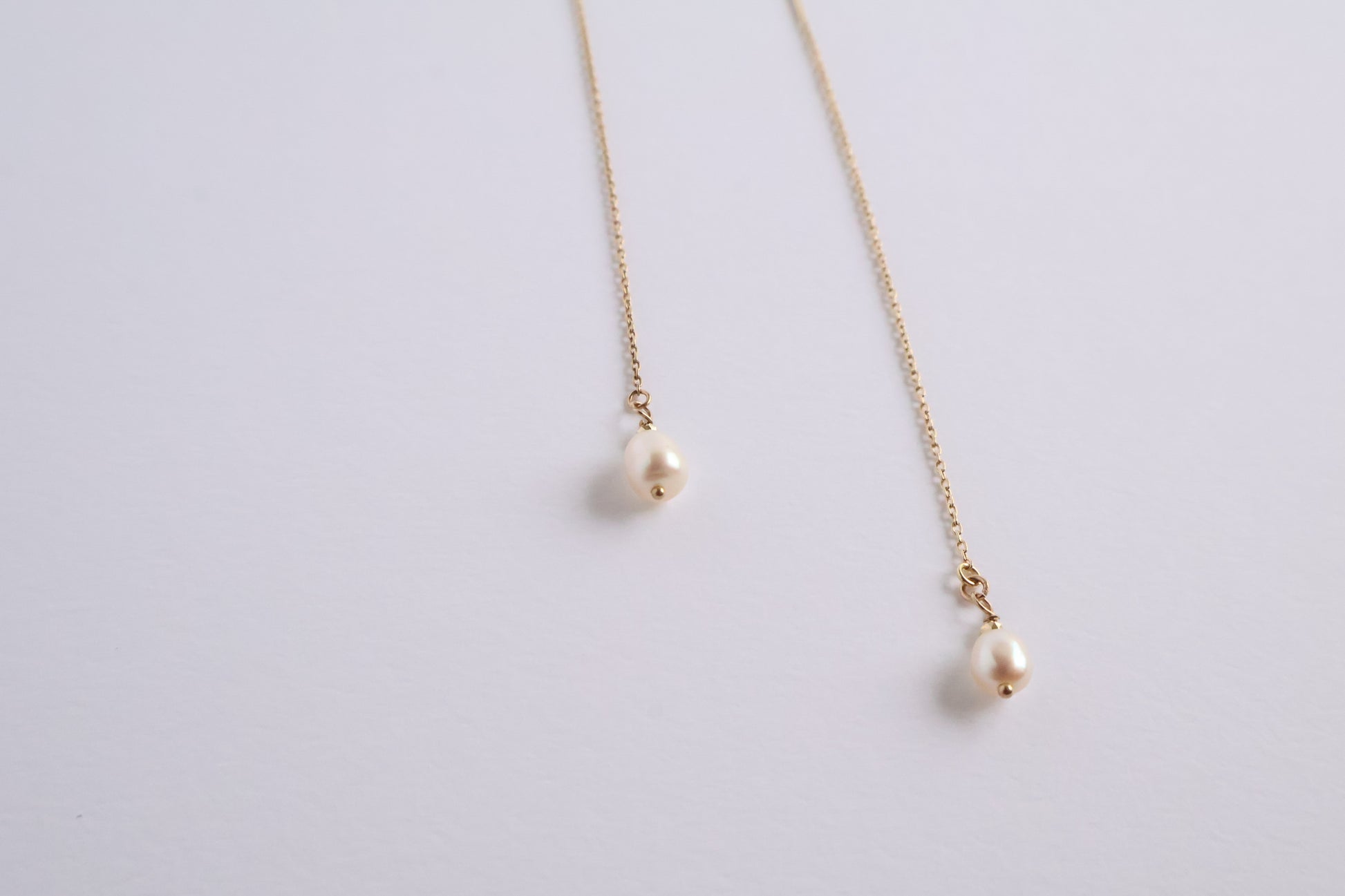 淡水パールを一粒あしらった、繊細な10Kチェーンのロングピアスです。