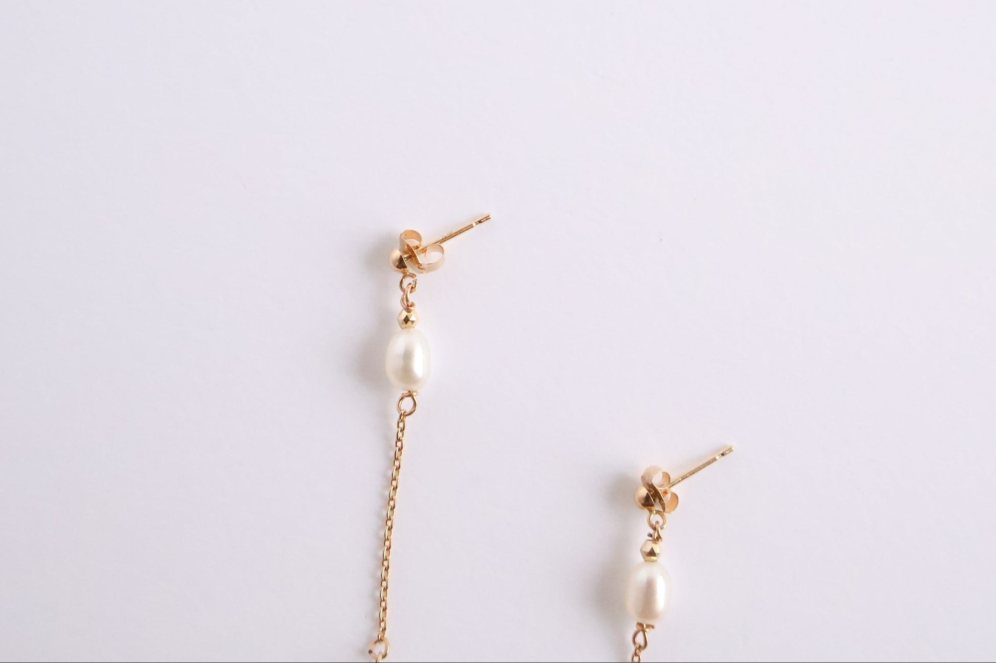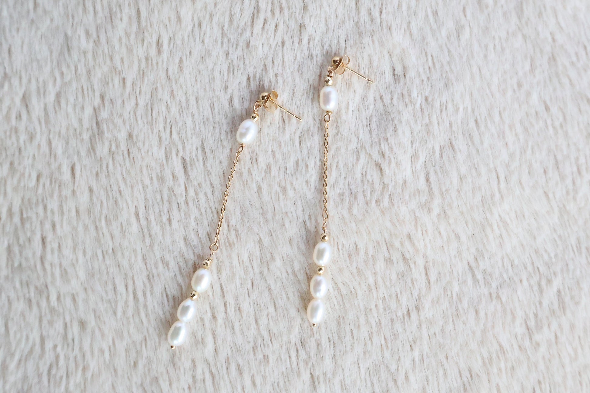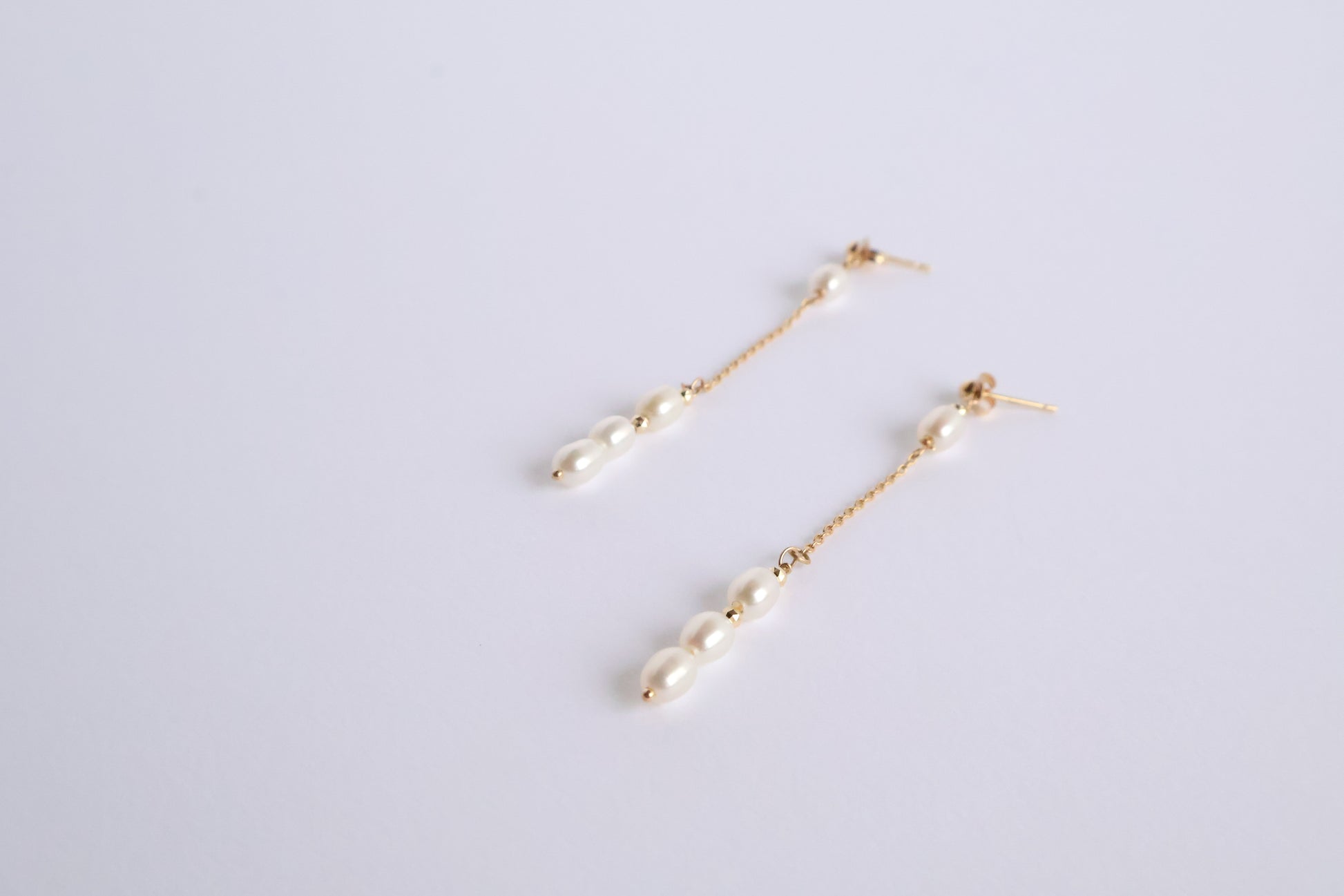淡水パールを縦に連ねた、10Kチェーンのドロップピアスです。