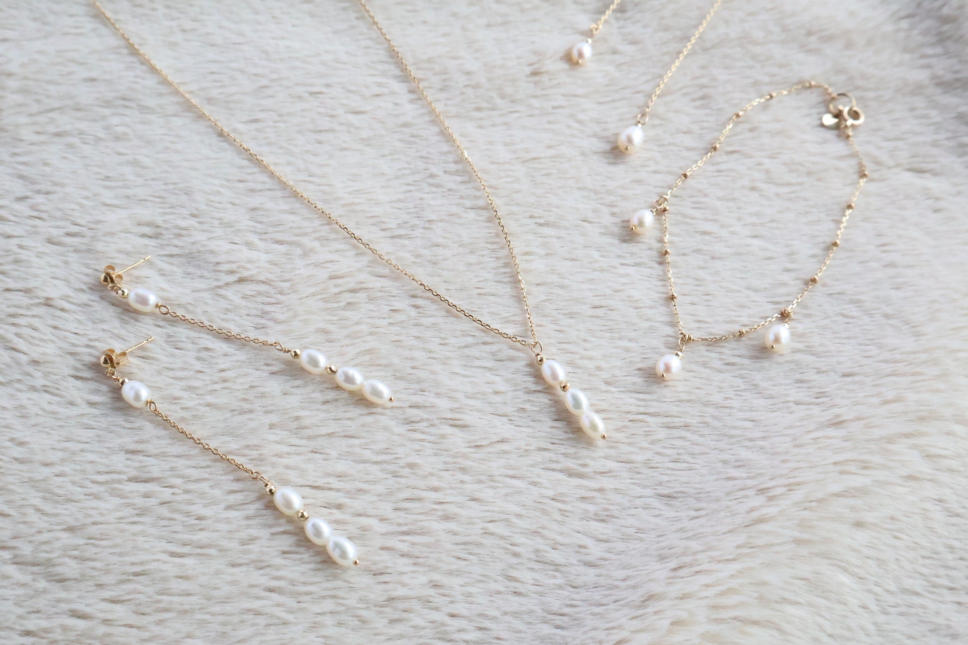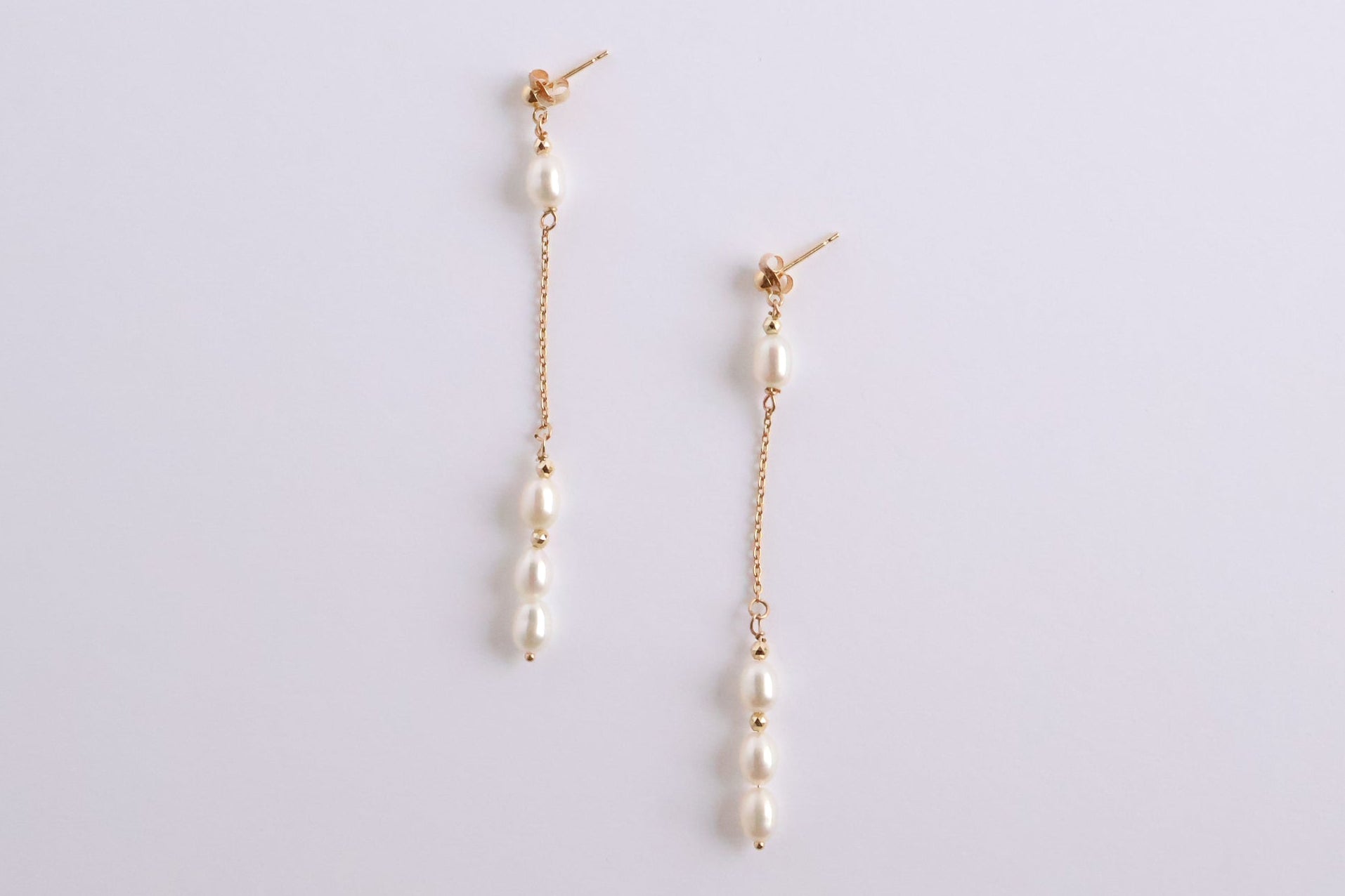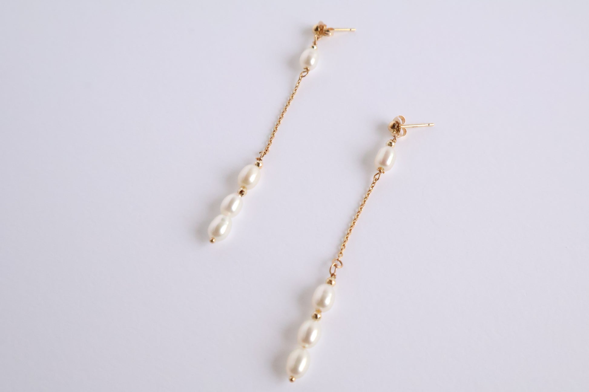 淡水パールを縦に連ねた、10Kチェーンのドロップピアスです。