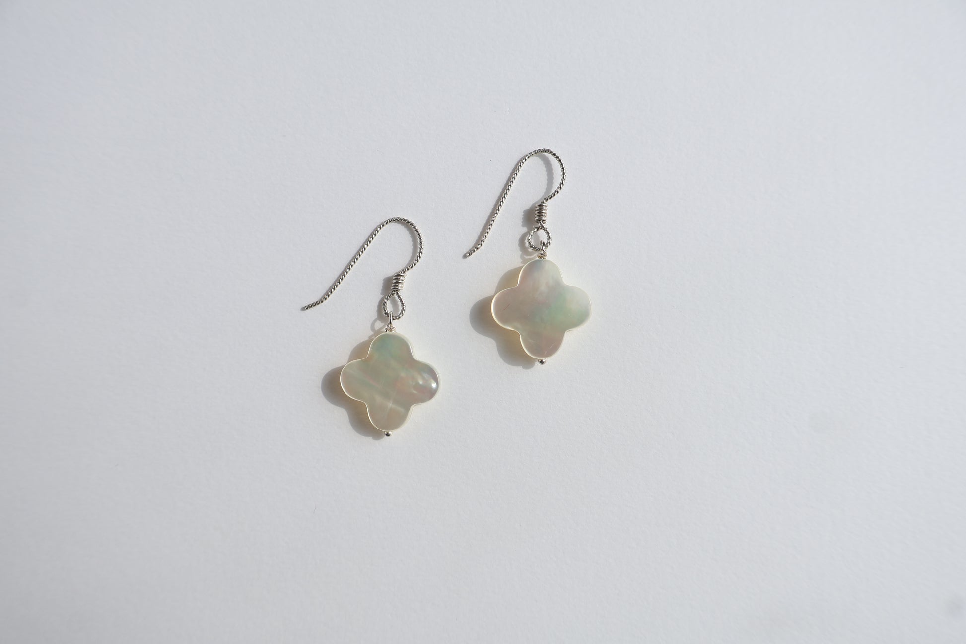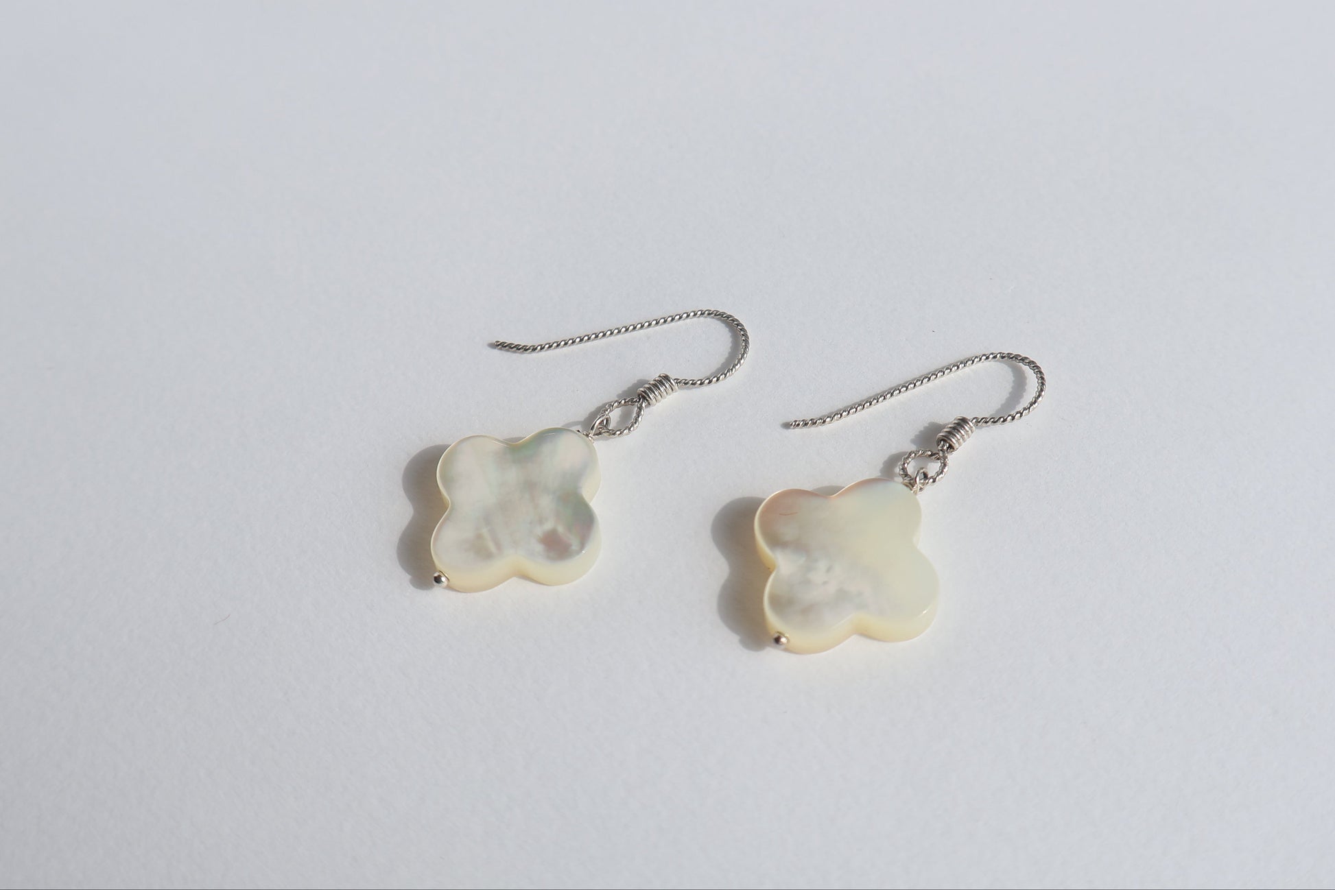 優しく照るような上質なマザーオブパール。手にとってみるとオーロラにめらめらと波打つような美しさが魅力です。ホワイトシルバーのピアスはスパイラルになっていて、小さな光をたっぷりと反射するのでキリッとした銀色よりホワイトな輝きが特徴。
