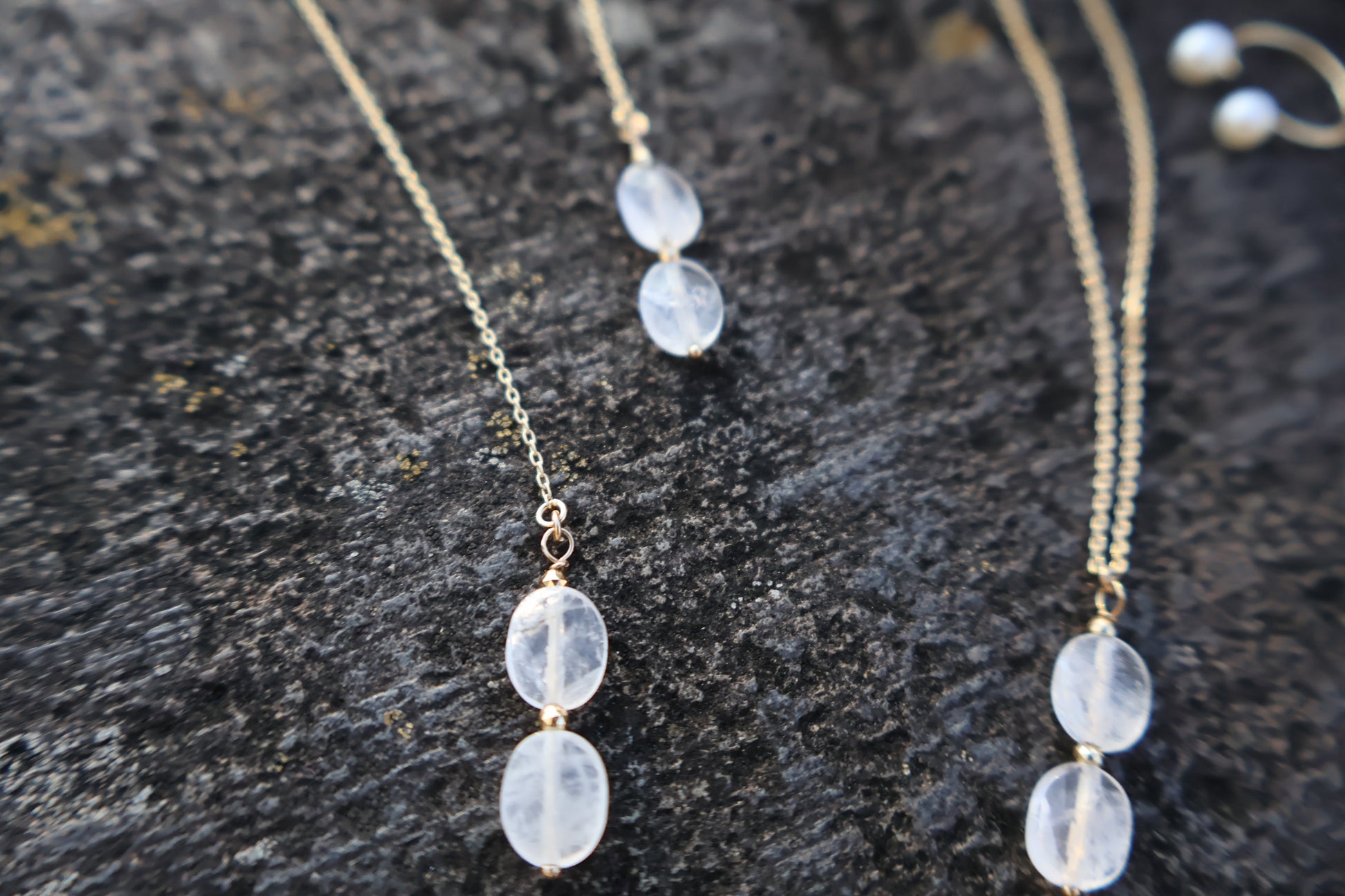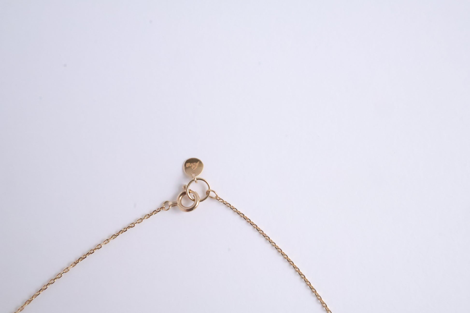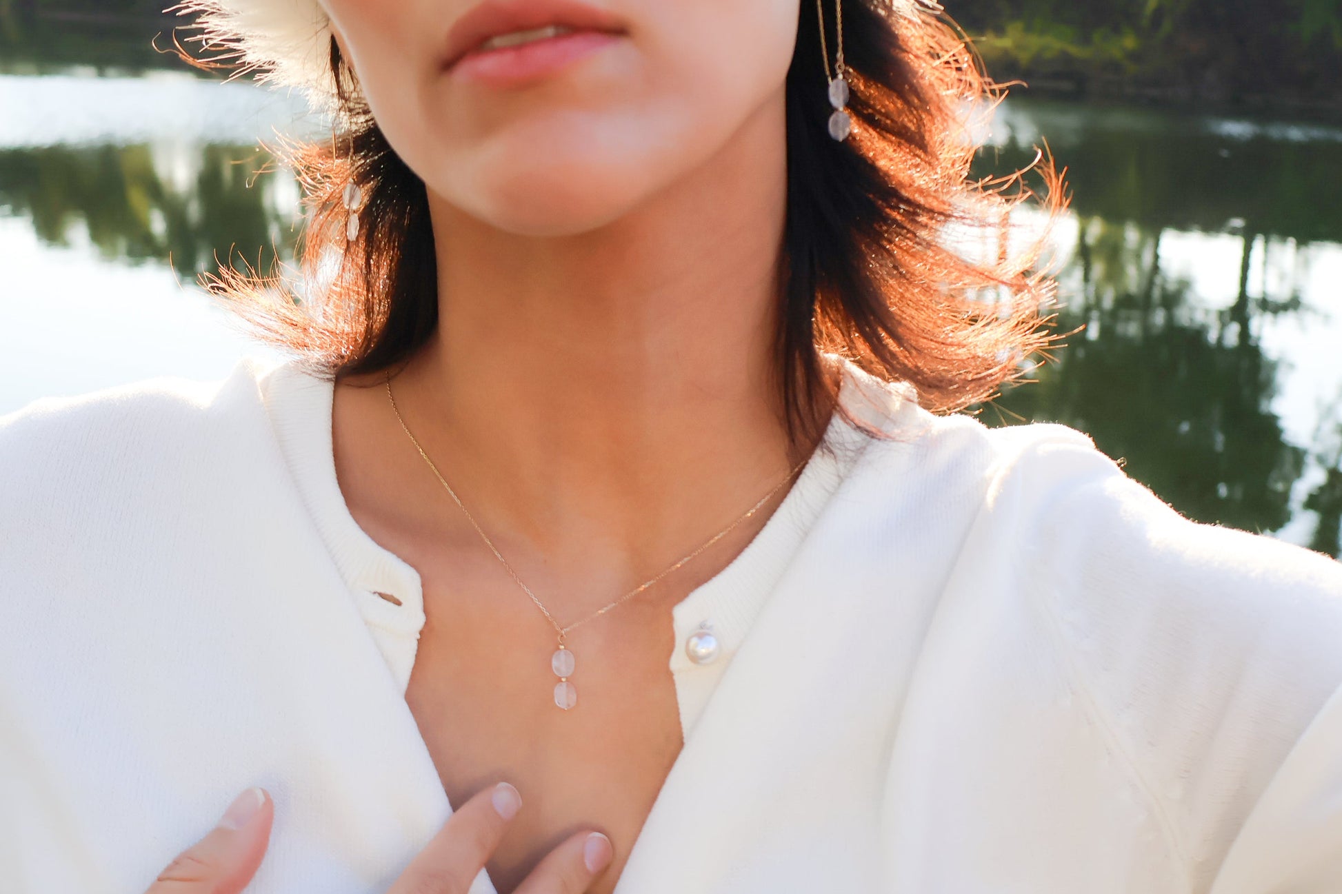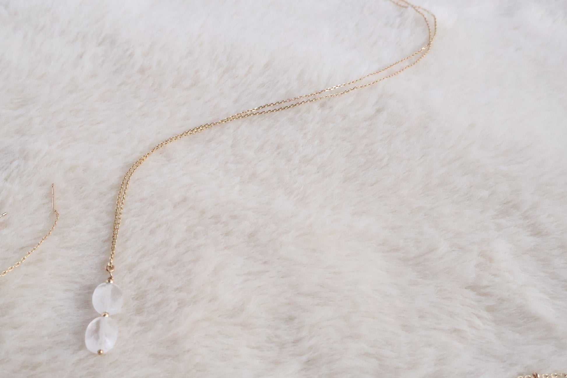 石の透明感とゴールドの細いラインが、デコルテにやさしい輝きを描きます。
