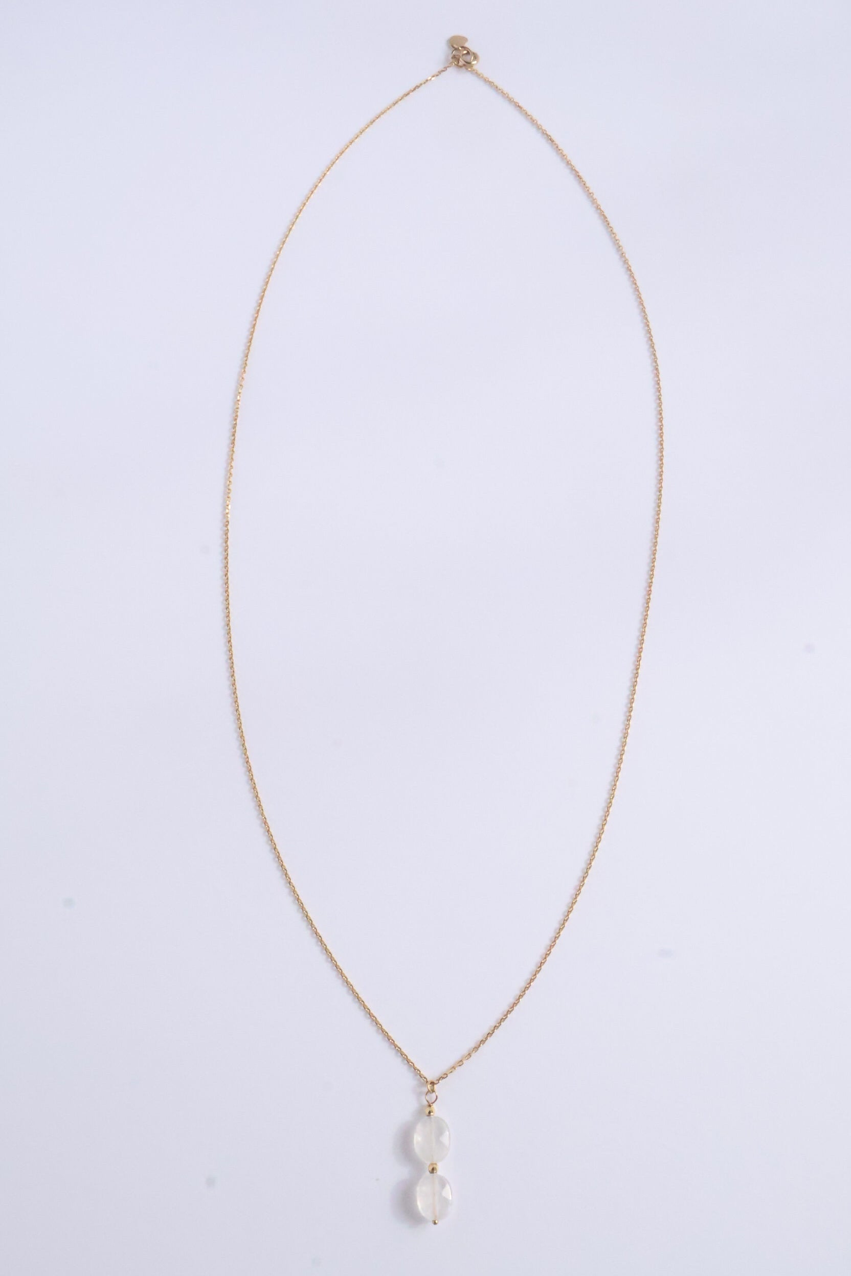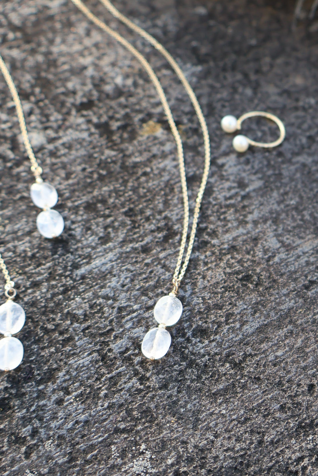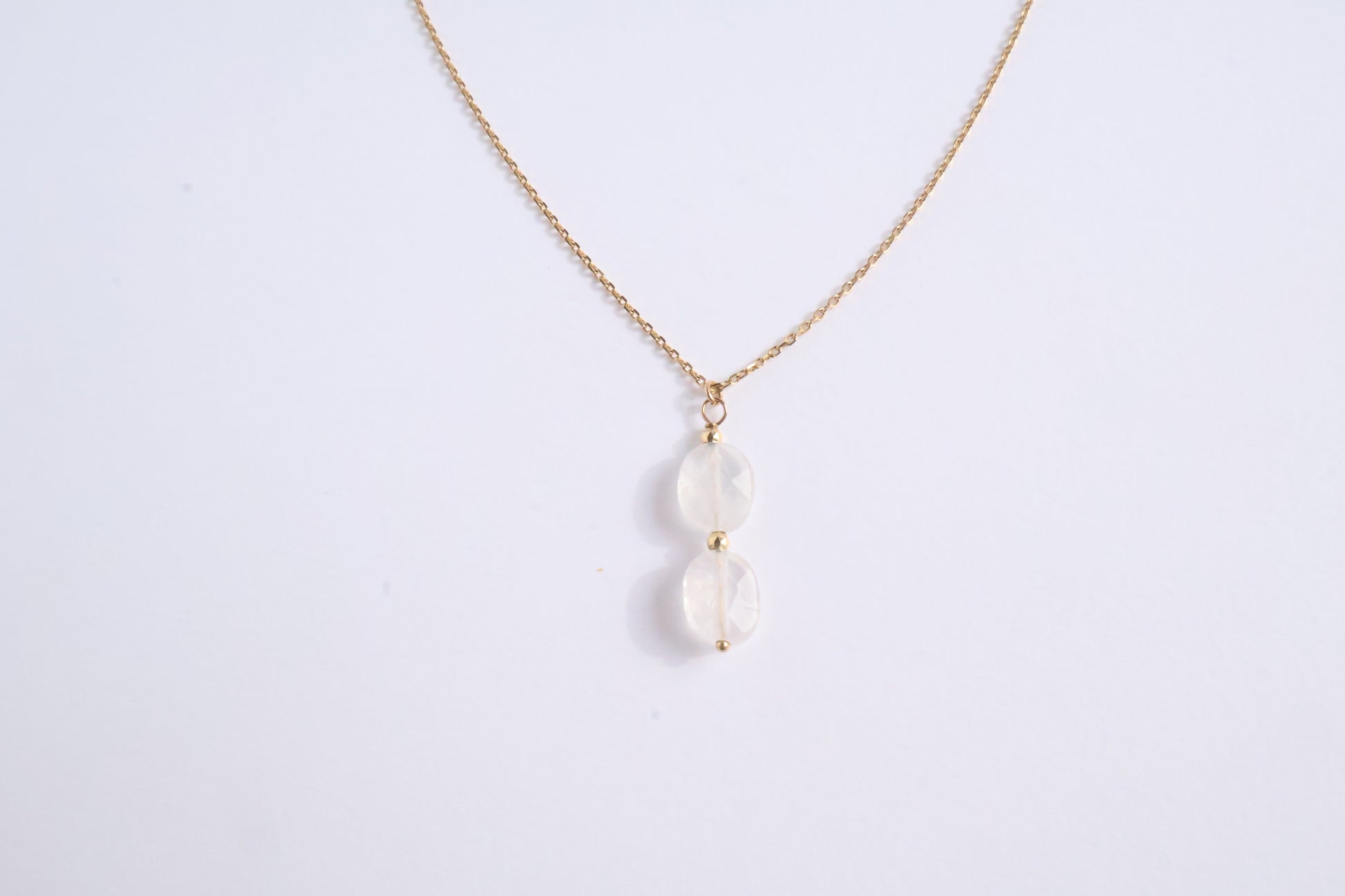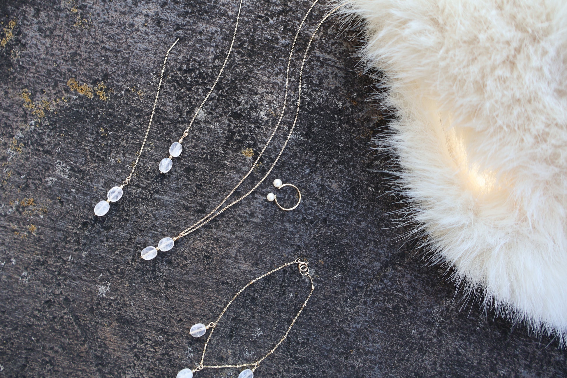 石の透明感とゴールドの細いラインが、デコルテにやさしい輝きを描きます。